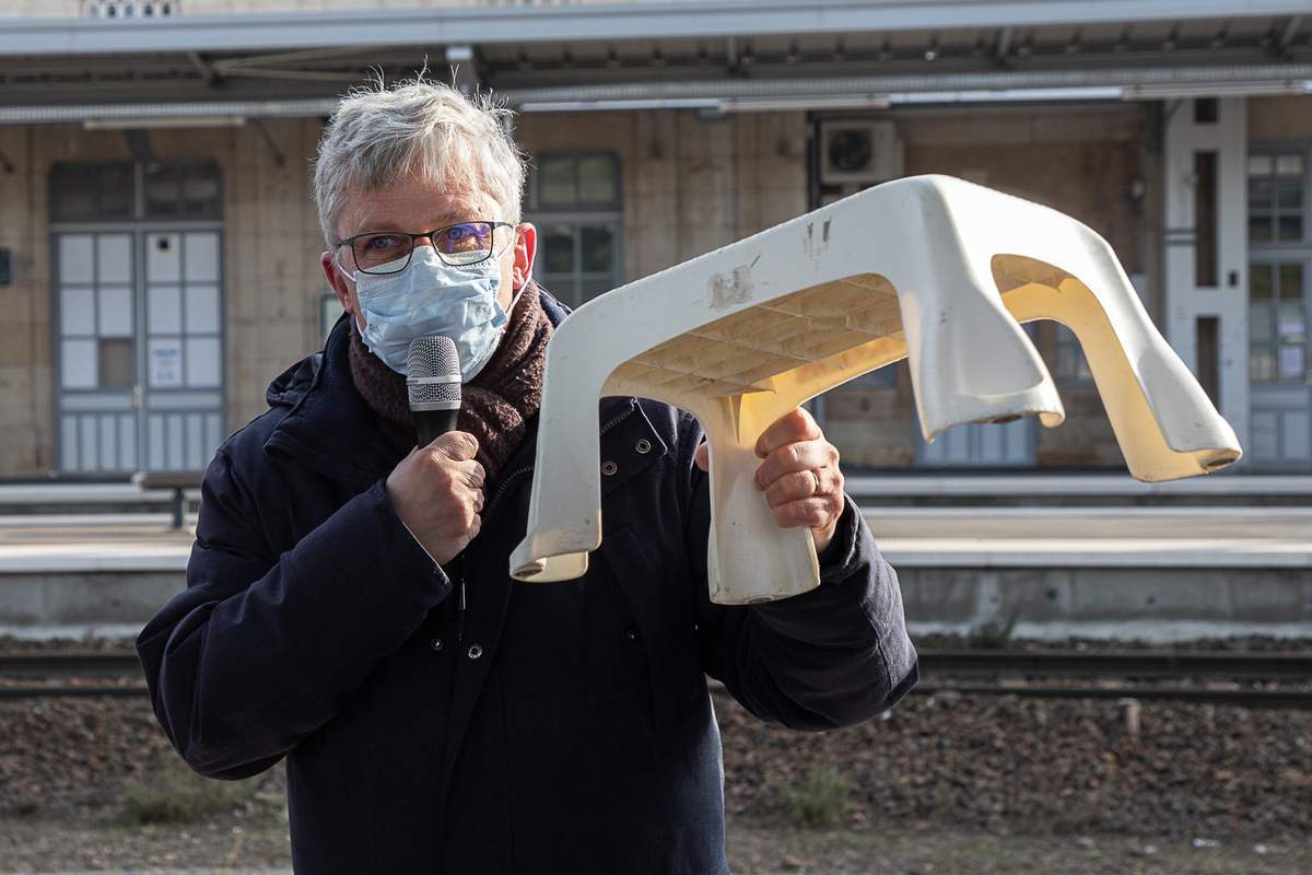 Brandissant un marchepied en plastique, Eric Cinotti, directeur régional SNCF Mobilités, a rappelé comment les agents de la gare de Dole géraient la question de l’accessibilité avant les travaux : « Il n’y a encore pas si longtemps, l’accessibilité en gare de Dole, c’était ça ! ».