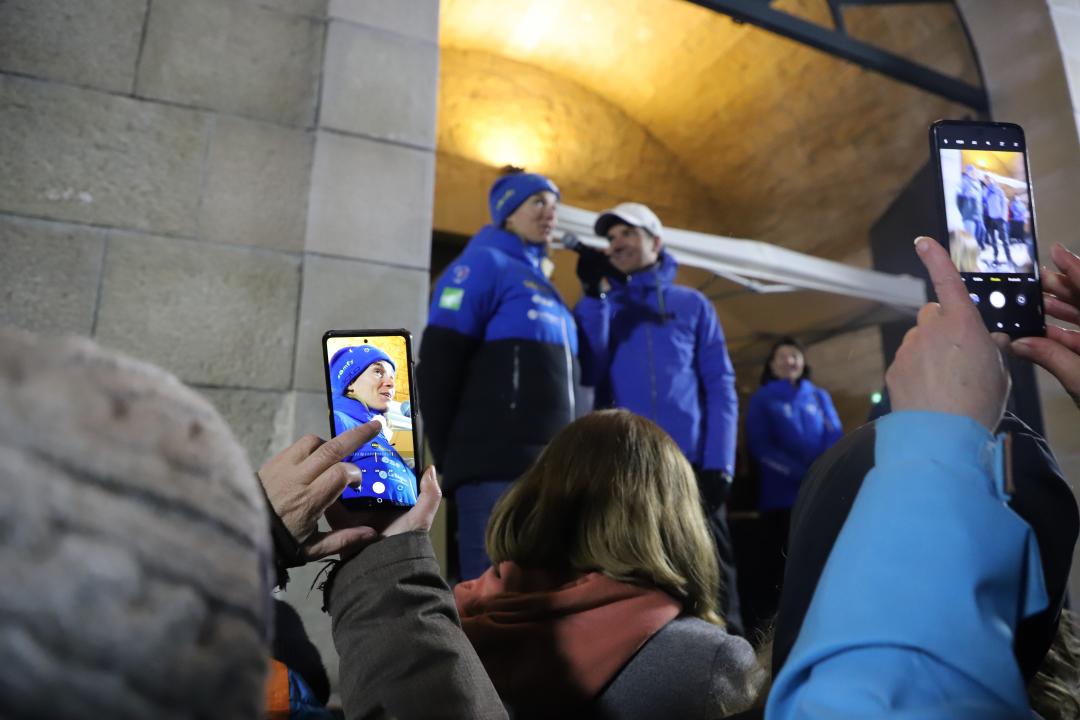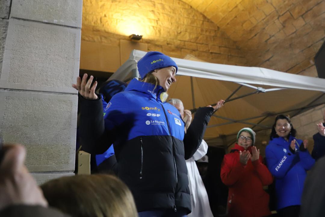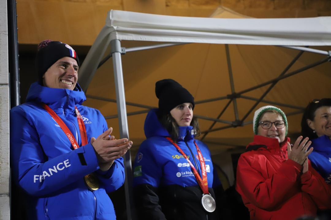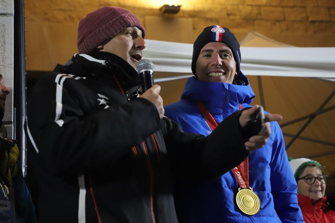 La soirée s’est poursuivie sur la place d’armes de l’ancien fort militaire reconverti par Juraflore en caves d’affinage de comté. Devant un public venu nombreux malgré le froid et la neige, les médaillés olympiques en ski nordique ont été célébrés par la Fédération française de ski. « Quintuple » Fillon-Maillet a évidemment été fêté comme il se doit par ses supporters. Anaïs Bescond a également reçu un bel hommage qui a touché au cœur la biathlète de Morbier. Dimanche 3 avril, « Nanass » disputera une dernière course –le relais– aux Tuffes avant de raccrocher les skis et la carabine après presque 15 ans au plus haut niveau. À son palmarès : trois médailles olympiques, huit podiums en championnats du Monde et une victoire en coupe du Monde. Bravo et merci championne !