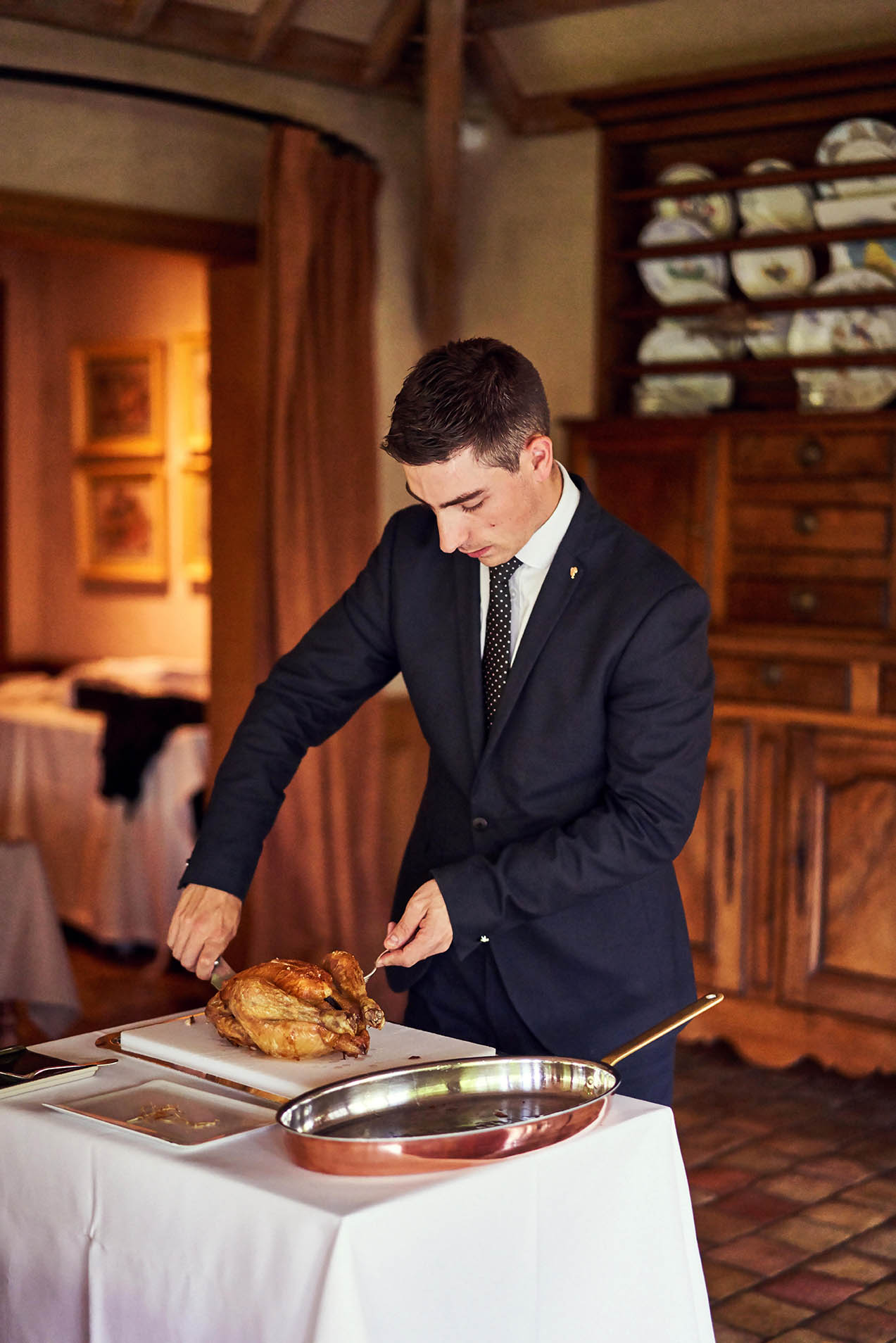 - Découpe d’un plat préparé en cuisine – une volaille- et servi devant une table du jury. L’élégance, la rapidité, l’efficacité et la réponse aux besoins du client sont pris en compte.