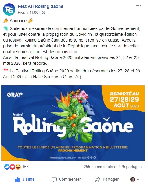A Gray (70), Rolling-Saône a également réussi à décaler sa programmation (du 21 au 23 mai -> du 27 au 29 août, tout comme le Festival de musique de Besançon-Montfaucon (25) (du 25 mai au 2 juin -> du 27 au 30 août) ou encore le Festival de la manufacture d'idées à Hurigny (71) ( du 20 au 24 mai -> du 21 au 23 août) qui proposera un festival en version « raccourcie et remaniée ».