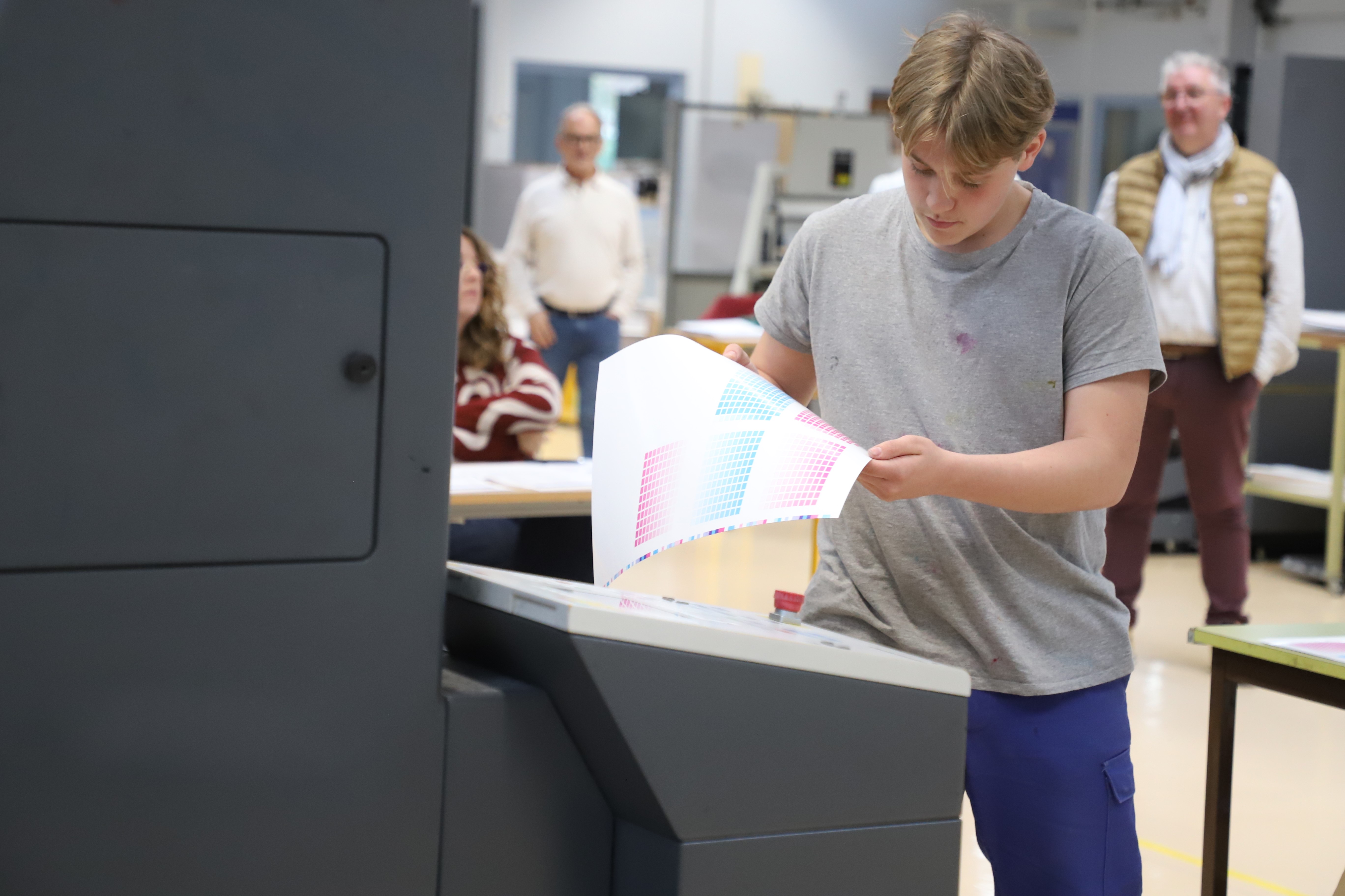 Ce mercredi matin, c’est dans les ateliers du lycée que les festivités sont lancées. Avec quatre candidats face à quatre machines, un tirage au sort s’est tenu pour déterminer quel candidat débutera sur quelle épreuve, chaque jeune effectuant ainsi un roulement d’une heure par spécificité. Avec une petite particularité : en effet, les sujets de l’épreuve d’imprimerie sont proposés au niveau national, avec la possibilité d’être adaptés dans chaque établissement en fonction du parc de machines disponibles. « On a essayé de balayer un maximum le spectre de tout ce qui se fait en imprimerie. Le but du jeu c’est d’imprimer sur chaque machine mais chacun des systèmes est vraiment différent, ce qui demande des aptitudes d’adaptabilités, c’est satisfaisant. » précise Bruno Mariotte, leur encadrant.