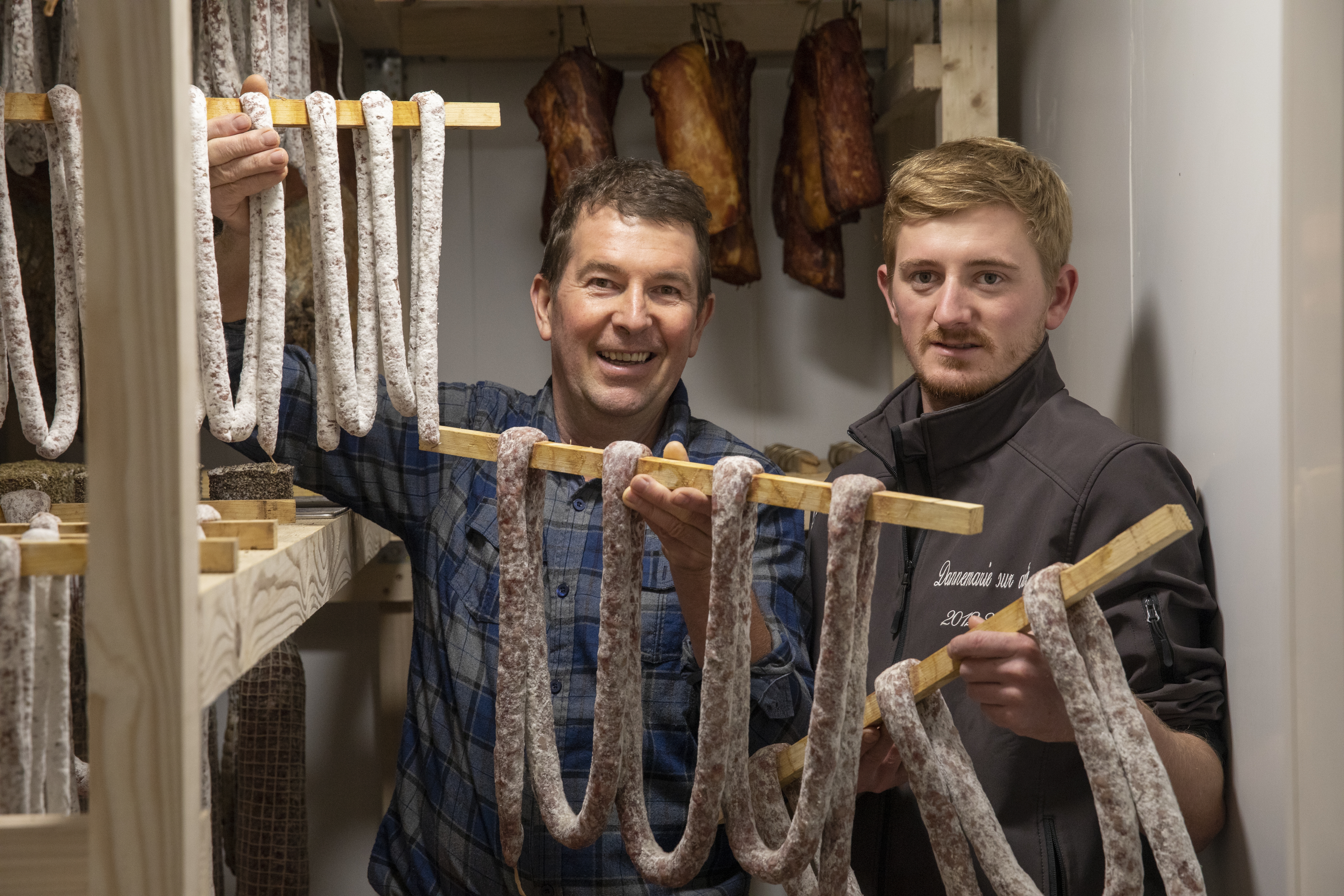 Depuis février 2019, Roland a été rejoint sur l’exploitation par son fils aîné Louis-Marie, 27 ans et la tête pleine de projets : construction d’un nouveau bâtiment encore plus confortable pour les animaux et mise en place d’une filière ultra-locale pour proposer du porc 100 % fontainois. Les animaux seront en effet nourris avec des aliments issus du village : le petit lait de la fruitière à comté et les résidus de production d’une biscuiterie. « On va juste les complémenter en graines de lin pour rester dans le cahier des charges Bleu-Blanc-Coeur et continuer à proposer des produits riches en Oméga 3 » précise le jeune agriculteur. Chez les Bulloz, la flamme agricole n’est pas près de s’éteindre.