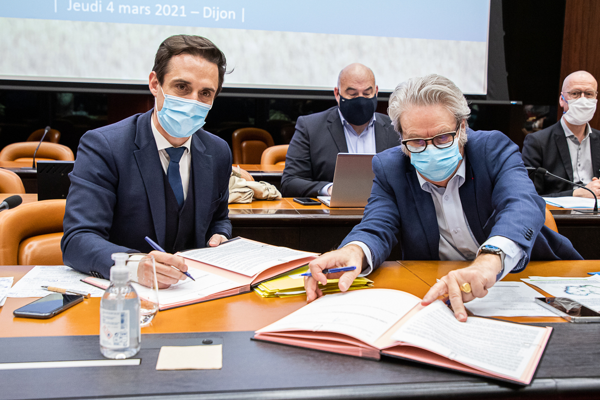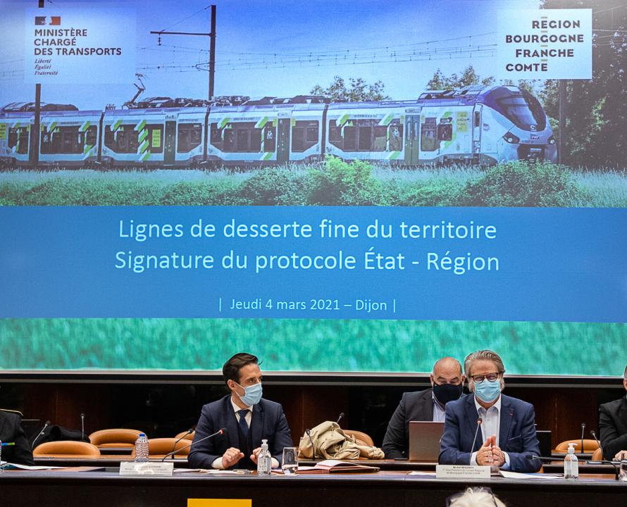 La Région et l’État ont validé l’accord sur le financement des travaux de 644 km de petites lignes ferroviaires en Bourgogne-Franche-Comté. La convention entre les deux parties a été signée jeudi 4 mars 2021 à Dijon, par Jean-Baptiste Djebbari, ministre délégué chargé des Transports et Michel Neugnot, 1er vice-président de la Région, en charge des transports.