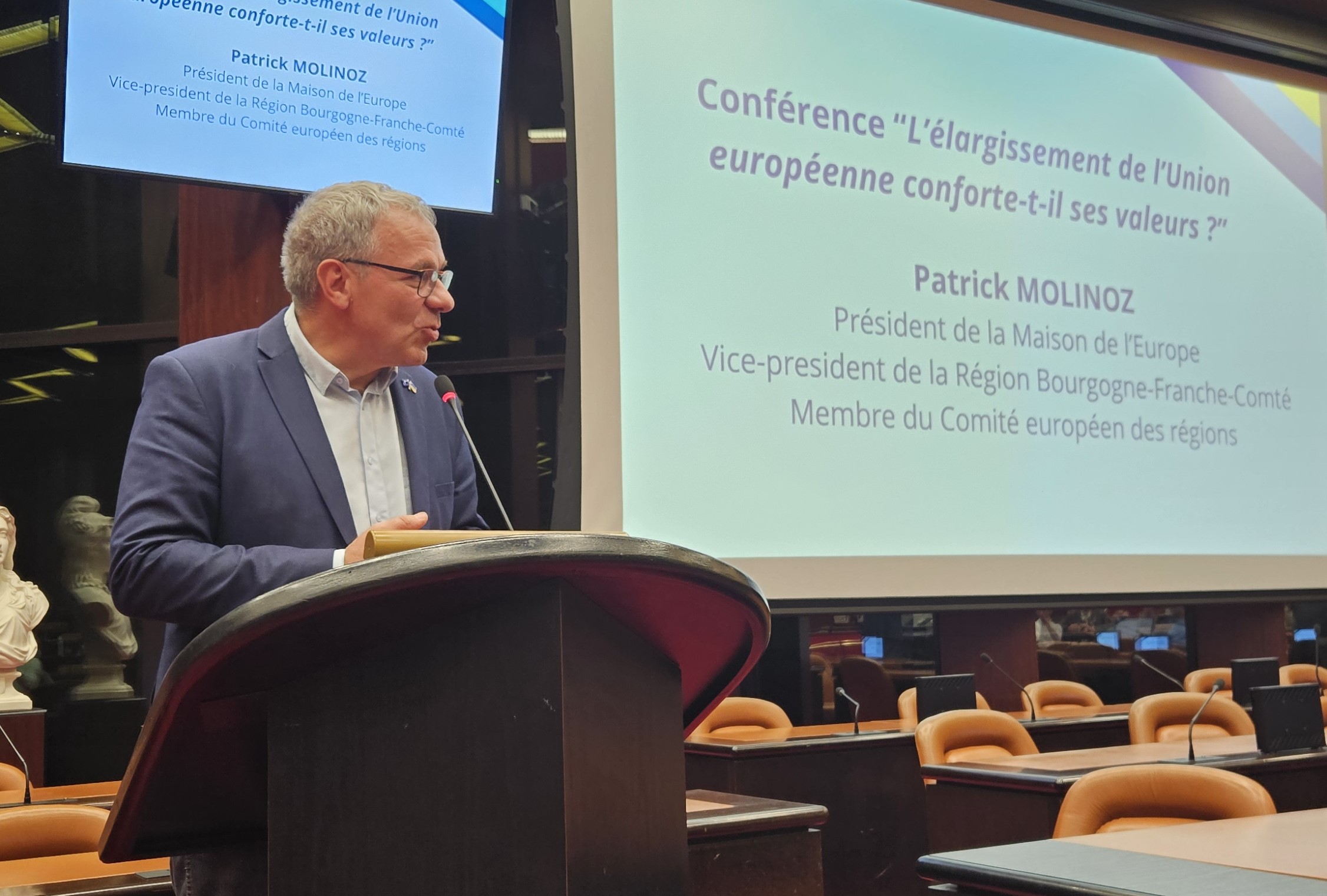 La première journée s’est terminée par une conférence ouverte par Patrick Molinoz, vice-président du Conseil régional et président de la Maison de l’Europe en Bourgogne-Franche-Comté, donnée par Lukas Macek, directeur du campus européen de Sciences Po Paris à Dijon sur le thème « L’élargissement conforte-t-il les valeurs de l’Union européenne ».