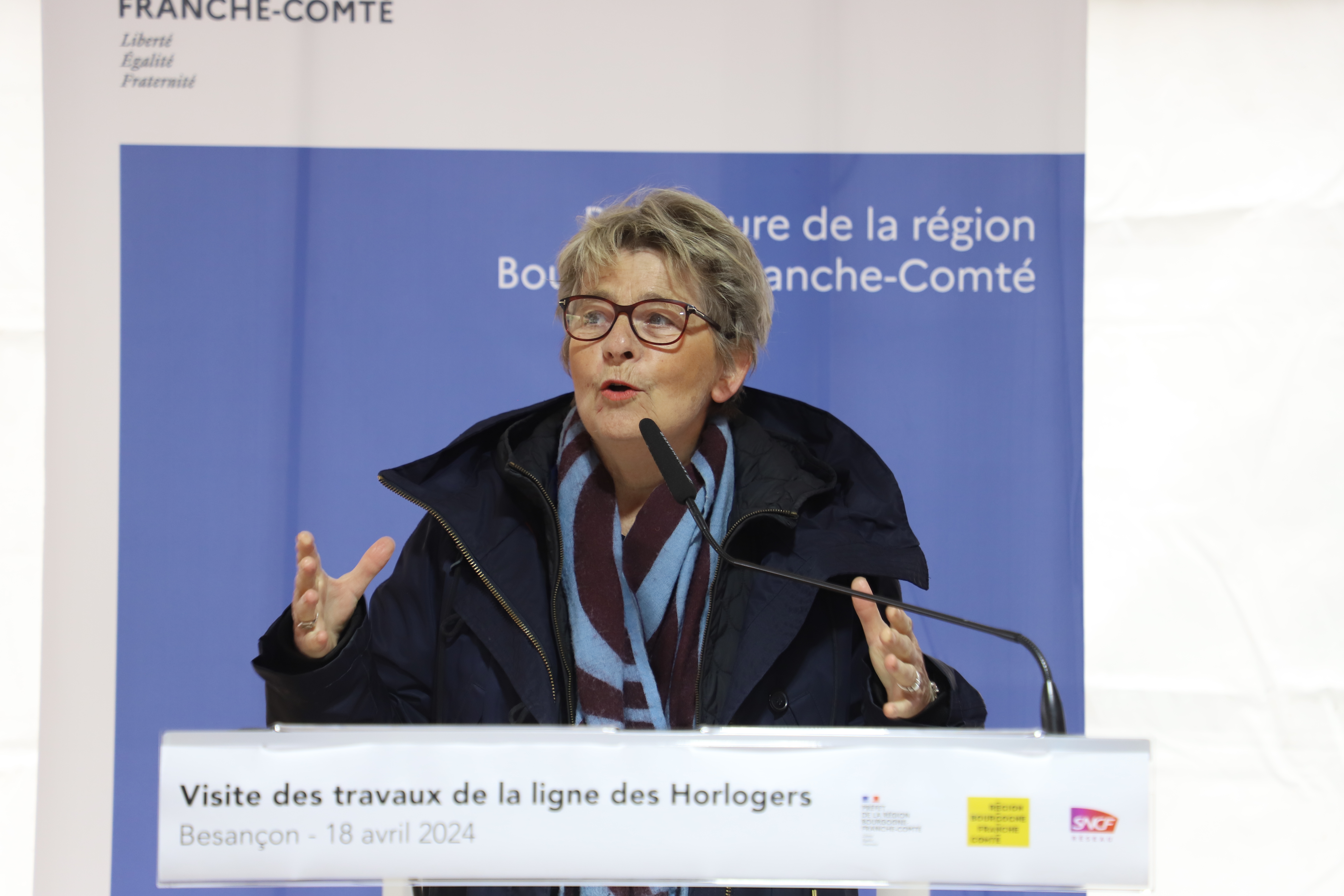 Jeudi 18 avril 2024, Marie-Guite Dufay, Présidente de la Région Bourgogne-Franche-Comté, a participé à la première visite de chantier des travaux de la ligne TER des Horlogers (Besançon – Le Locle), organisée par SNCF Réseau.