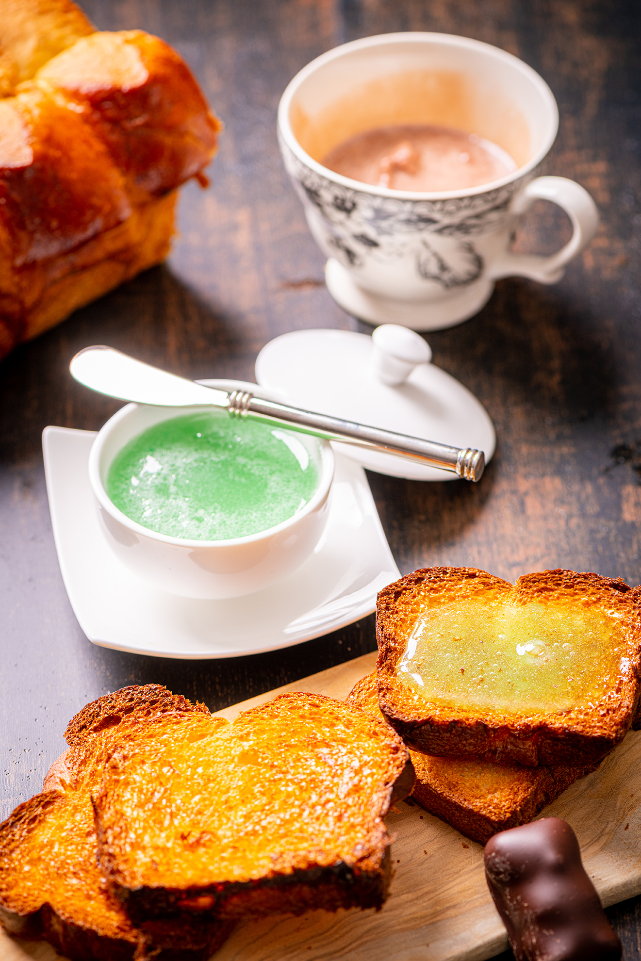 - La brioche. Coupez la brioche en tranches puis toastez-les.