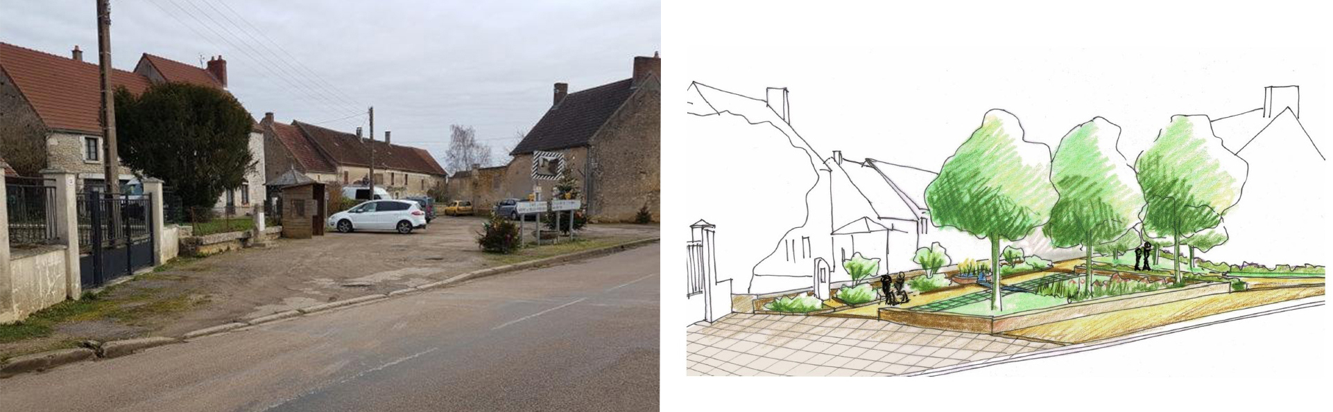 La place Yvette-André à Andryes (89) actuellement et le projet d’aménagement - DR