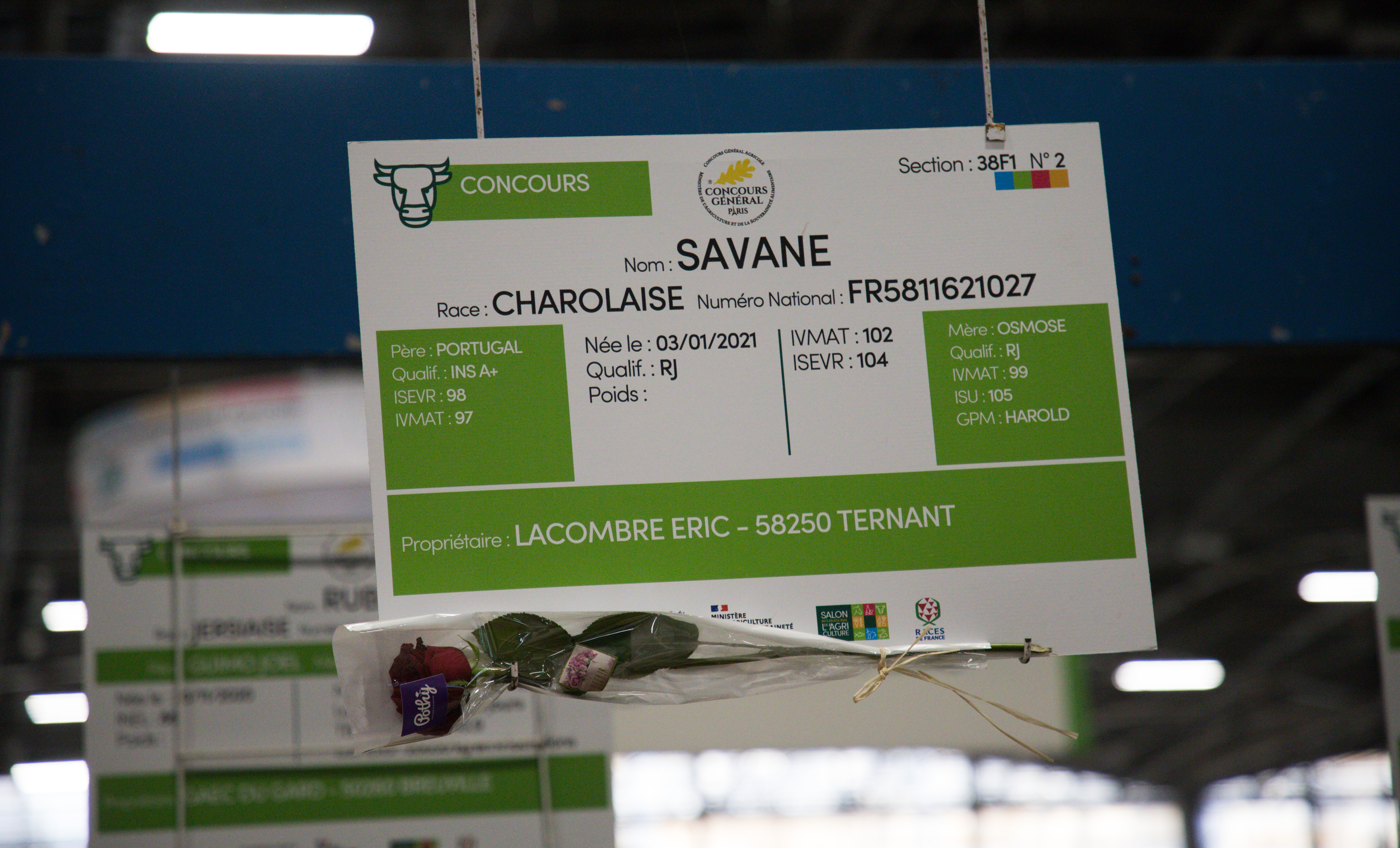 A son arrivée, la génisse s’est vu offrir une rose par le syndicat des Charolaises, en guise de bienvenue pour sa première participation.