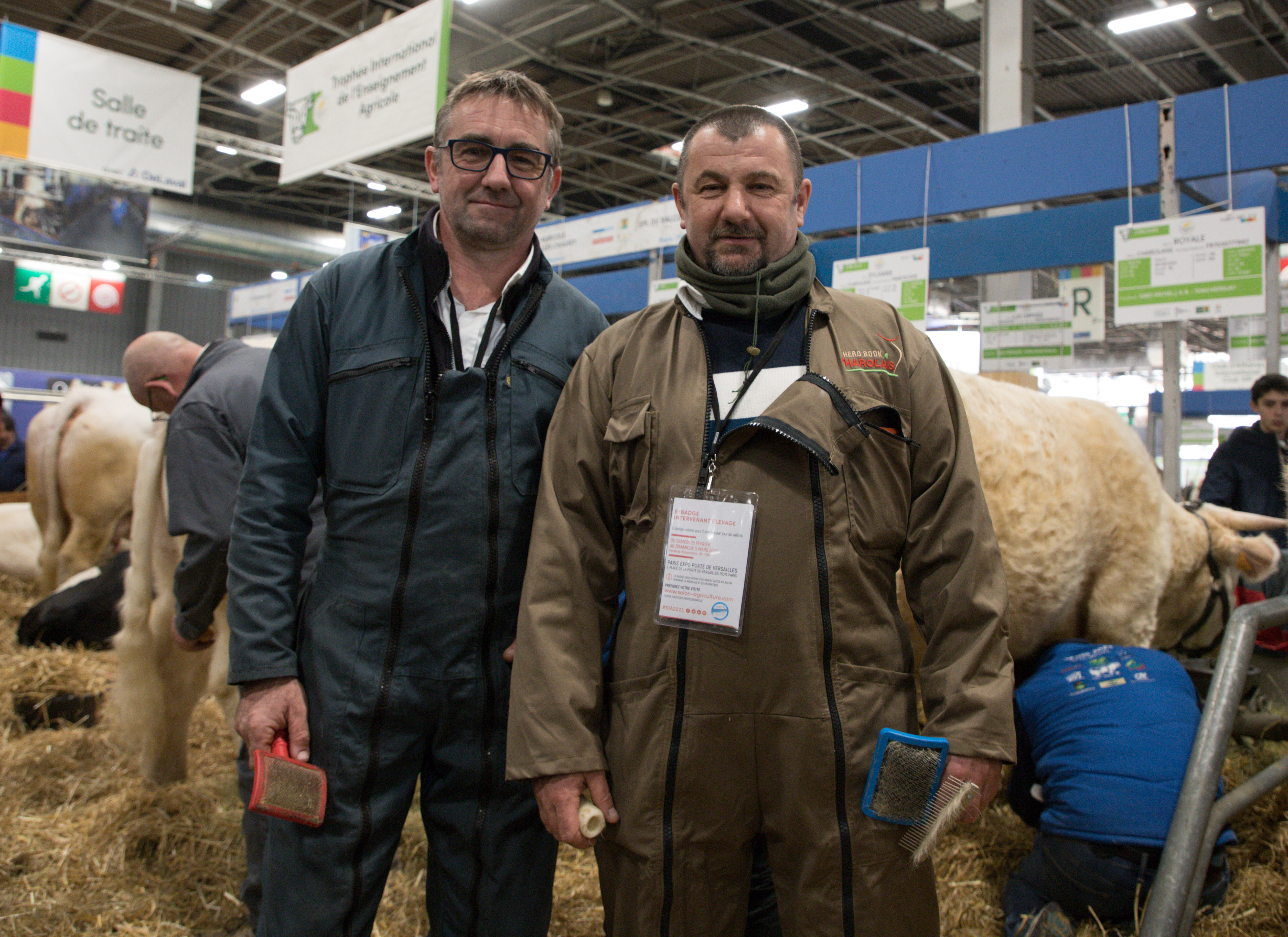 L’humeur est au beau fixe en fin de matinée, deux heures avant leur passage sur le grand ring du pavillon 1. Savane est entourée de Royale et de Superbelle. « Le voyage s’est bien passé, elle est en forme et calme, assure Éric en brossant sa vache. Elle a été pesée ce matin, elle pèse 865 kilogrammes. Le trajet lui a fait perdre 40 kilos mais c’est tout à fait normal », explique-t-il.