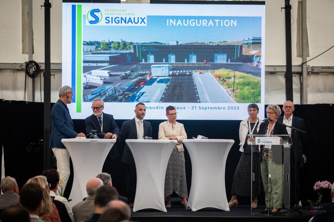 C'est à Chemaudin-et-Vaux qu'Eridan Skana, Président Directeur Général de l'entreprise, a décidé de relocaliser son activité de fabrication de panneaux de signalisation routière initialement installée à Rurey. Il avait repris en 2020 une entreprise en grande difficulté financière. L'entrepreneur et son équipe ont su sortir Franche-Comté Signaux de l'ornière. Menacée de disparition elle aurait entraîné la perte d'une trentaine d'emplois et d'un savoir-faire local reconnu. Il aura fallu moins de 3 ans à l'équipe actuelle pour sauver l'entreprise et la transformer complètement, jusqu'à l'inauguration de ces locaux modernes et fonctionnels à énergie positive !