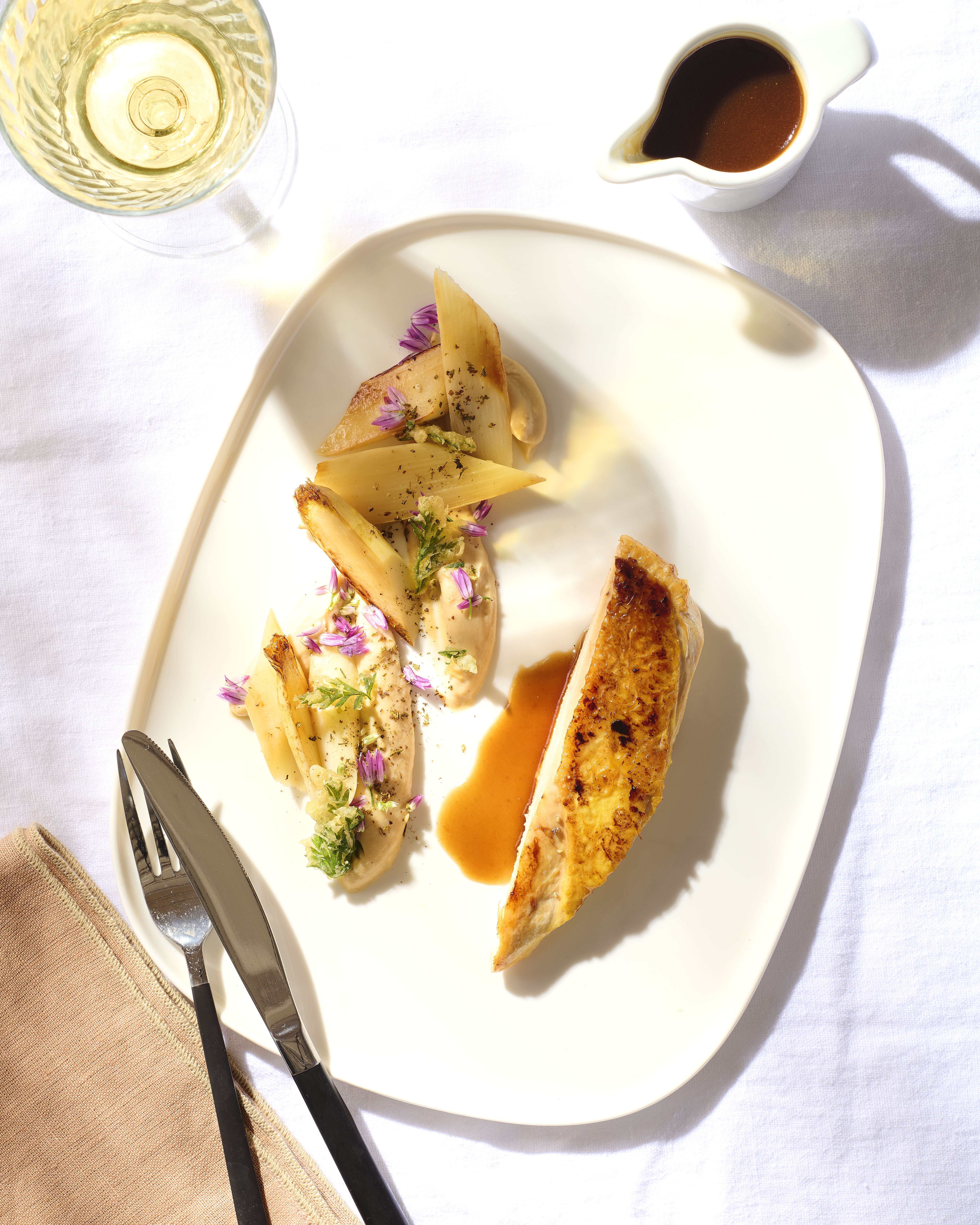 4. Dresser le suprême coupé en deux, avec des quenelles de chou-fleur et les asperges. Napper de jus de volaille.