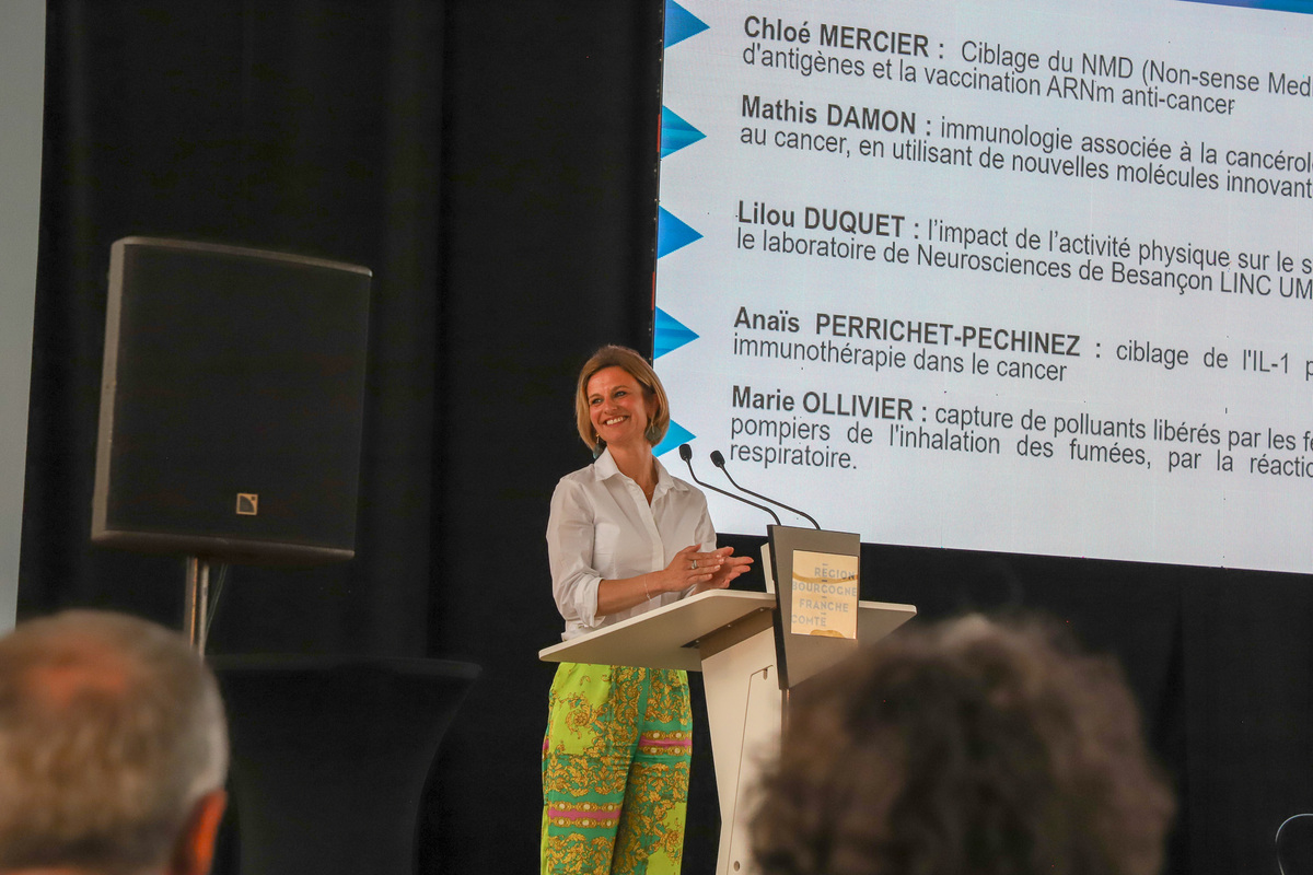 A cette occasion, 5 anciens lycéens de Besançon, Dijon ou Lons-le-Saunier ou venus d’ailleurs pour devenir doctorants, ont présenté leur thèse en 180 secondes, tous issus de la finale régionale organisée par l’Université Bourgogne-Franche-Comté.  Des parcours inspirants vers l’activité de recherche et des jeunes qui ont su partager leur passion et le sens de leur travail. A l’image de Chloé Mercier sur un sujet en lien avec la vaccination anticancer pour lequel elle a obtenu le prix du public à la finale du concours Ma thèse en 180 secondes ou de Lilou Duquet qui a étudié le lien entre l’activité physique et le sommeil en addictologie.