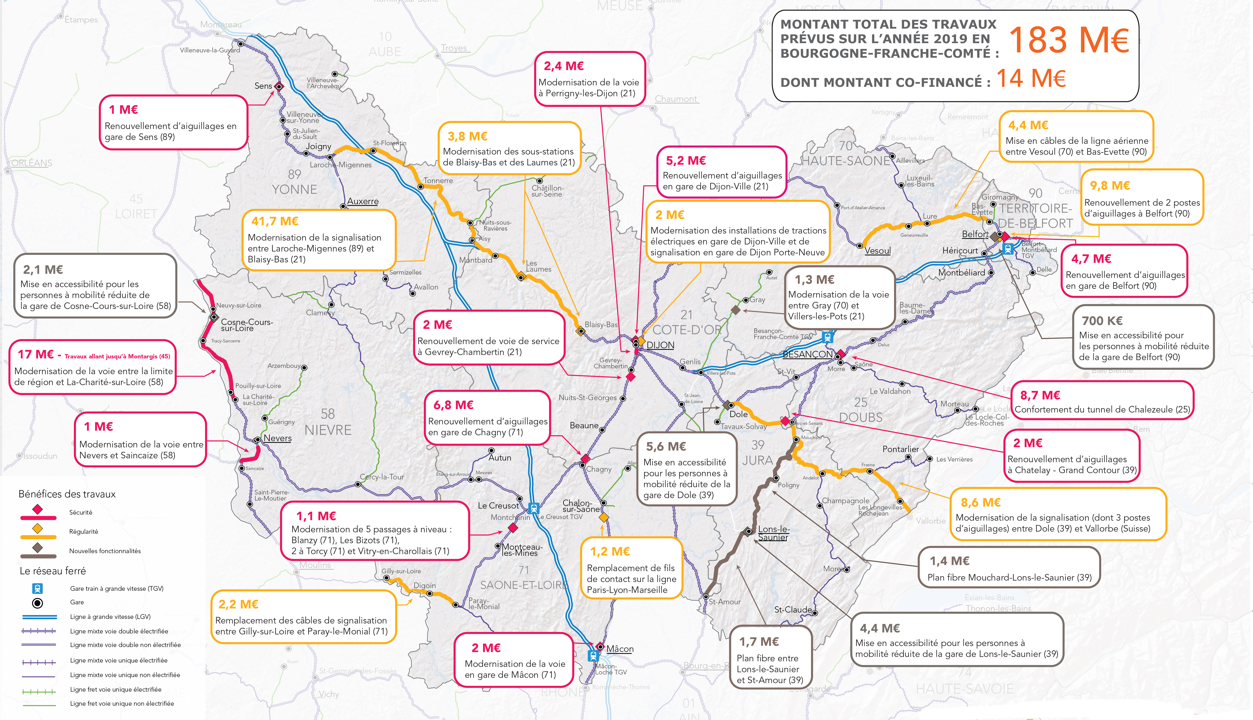 De son côté, la Région Bourgogne-Franche-Comté va concentrer ses efforts financiers dans la mise en accessibilité pour les personnes à mobilité réduite de quatre gares : Dole (5,6 M€), Lons-le-Saunier (4,4 M€), Cosne-sur-Loire (2,1 M€) et Belfort (700 K€). Pour chaque gare, la Région apportera 25% de financement, soit 3,2 M€.
