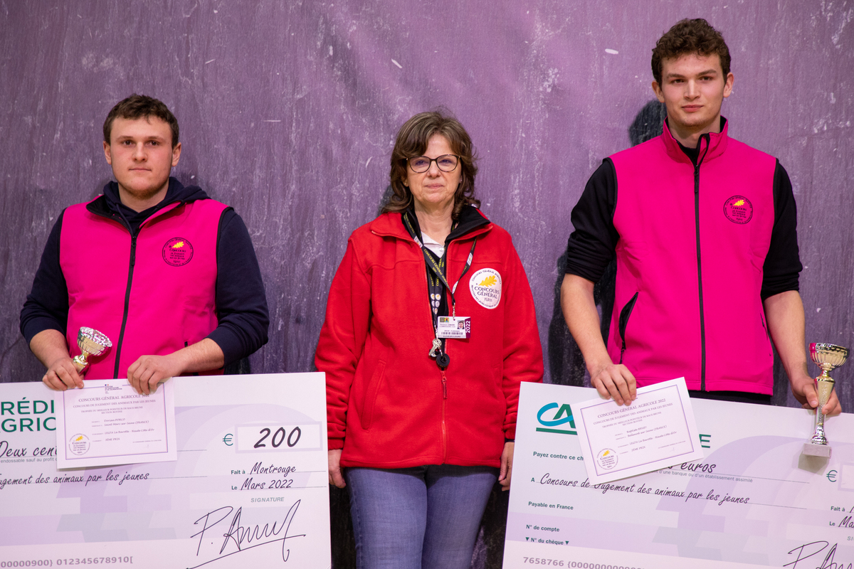 Dorian Porco et Baptiste Bruey, aux côtés de Florence Le Maire, directrice de l’EPL de la Barotte, sont montés sur le podium des pointeurs de la race Brune - Crédit photo Xavier Ducordeaux