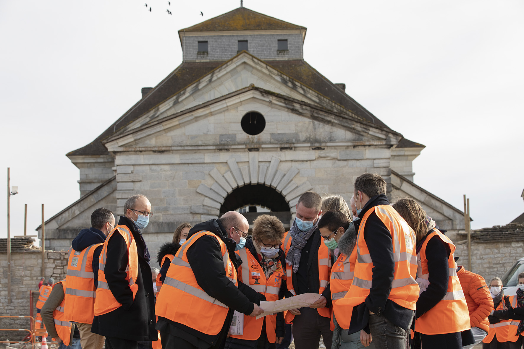 Lancés en octobre 2020, les travaux sont réalisés par des entreprises locales qui ont su allier leurs compétences pour décrocher ce prestigieux chantier. Lors d’une visite le 17 février 2021, Marie-Guite Dufay les a d’ailleurs félicitées d’avoir joué collectif  pour ce projet « à la hauteur du talent et des idées révolutionnaires de Ledoux ». Pilotés par l’établissement public de coopération culturel (EPCC) de la saline royale, les travaux sont co-financés par la Région Bourgogne-Franche-Comté, aux côtés du Département du Doubs, de l’État et de mécènes privés.