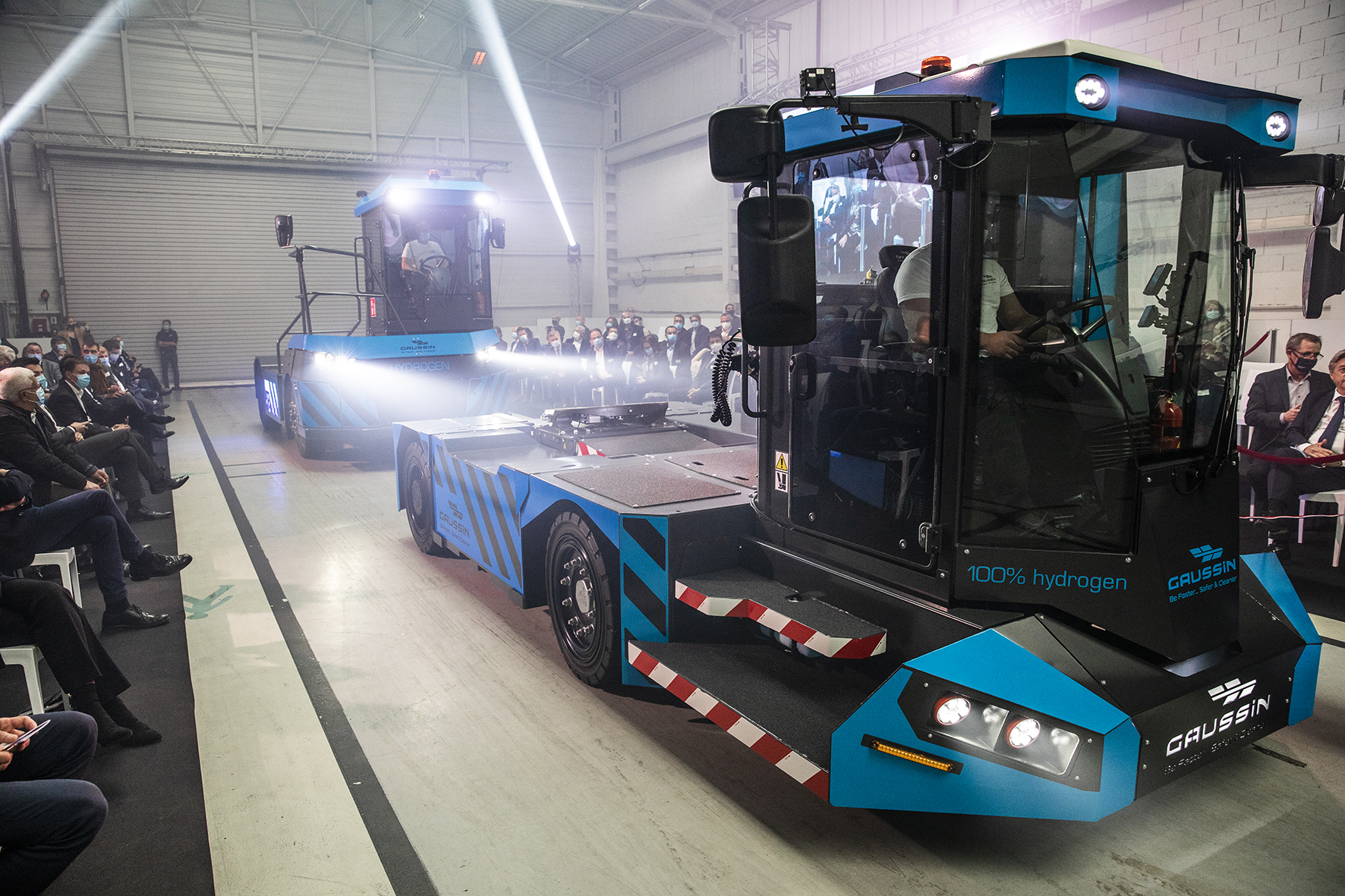 Ce 6 octobre, le groupe Gaussin, spécialiste des systèmes de manutention sur roues, avait mis les petits plats dans les grands pour présenter, lors d’une après-midi portes ouvertes, ses deux nouveaux véhicules en « première mondiale ». Destinés respectivement au transport de marchandises en centre logistique et dans les terminaux portuaires, l’ATM-H2 (38 t) et l’APM-H2 (75 t) fonctionnent à l’hydrogène. Ils sont équipés de réservoirs fabriqués par Faurecia à une quinzaine de kilomètres du siège de Gaussin à Héricourt (70).