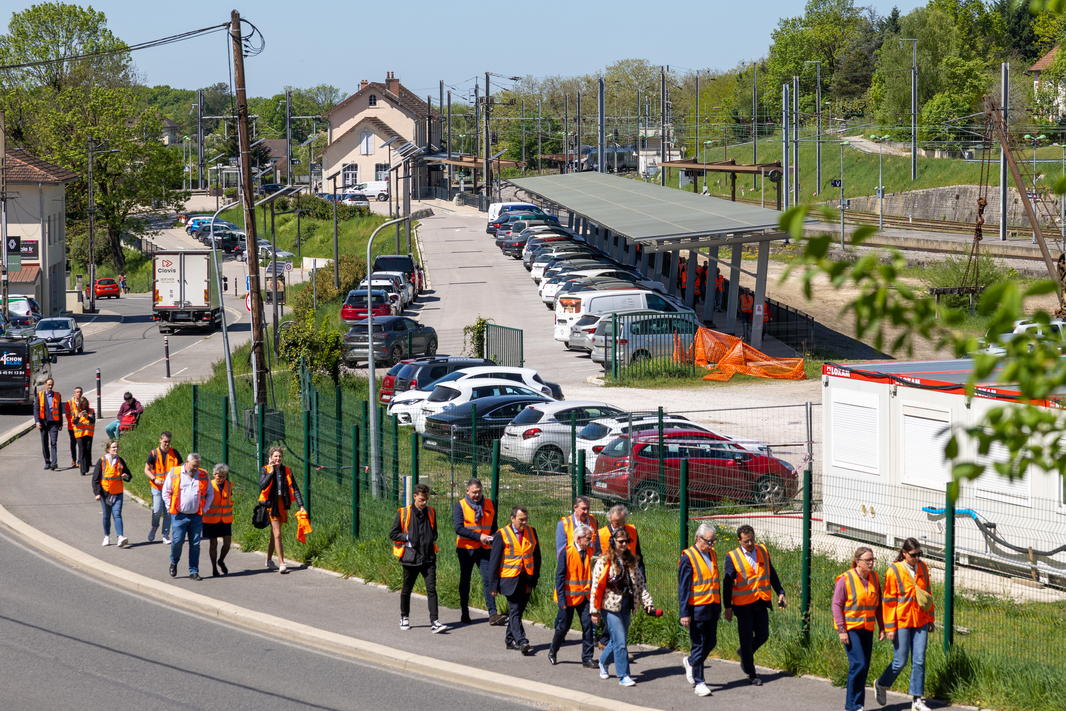 Elus et partenaires, réunis mardi 21 avril devant la gare de Mouchard. Photo Xavier Ducordeaux