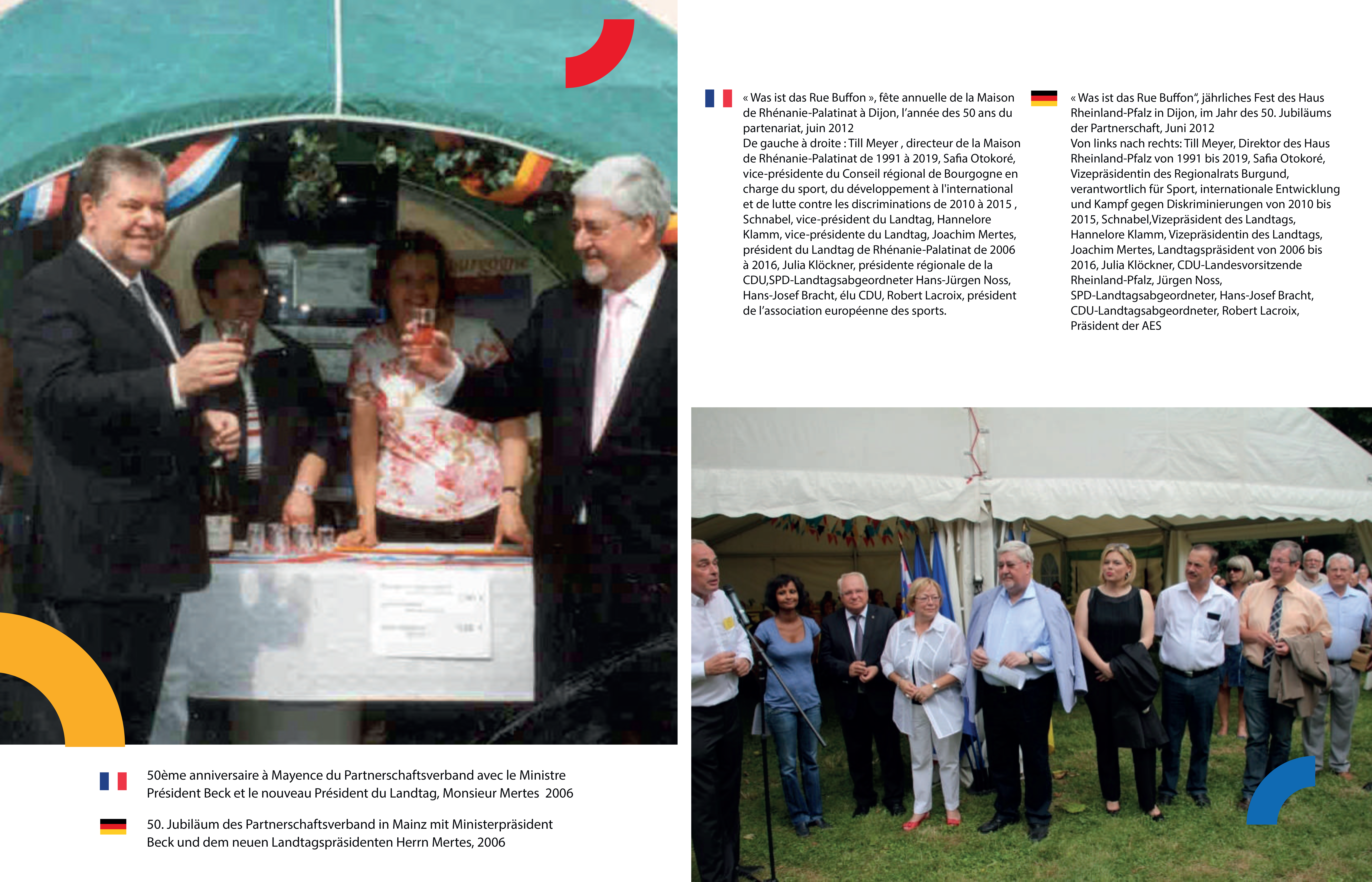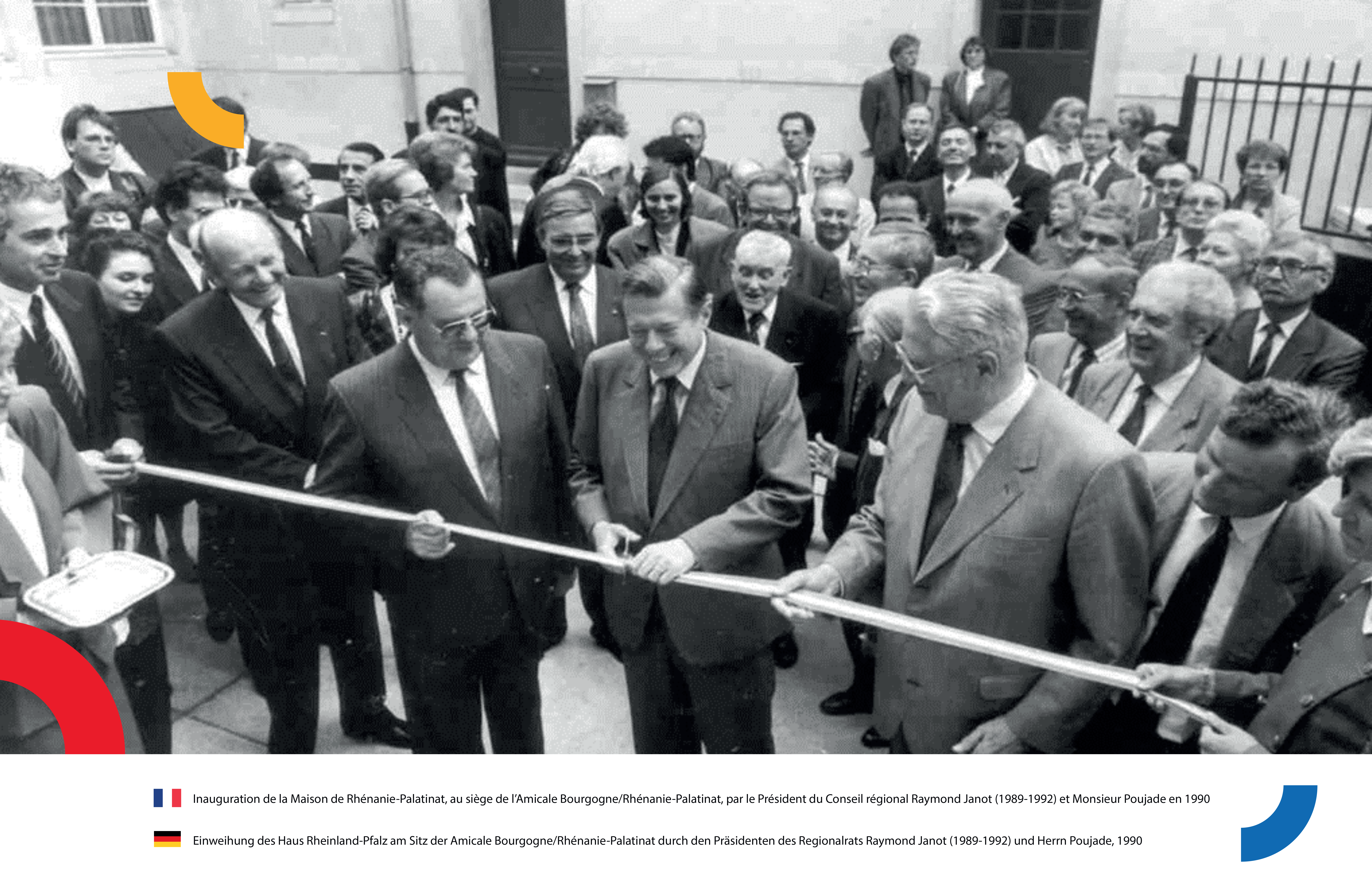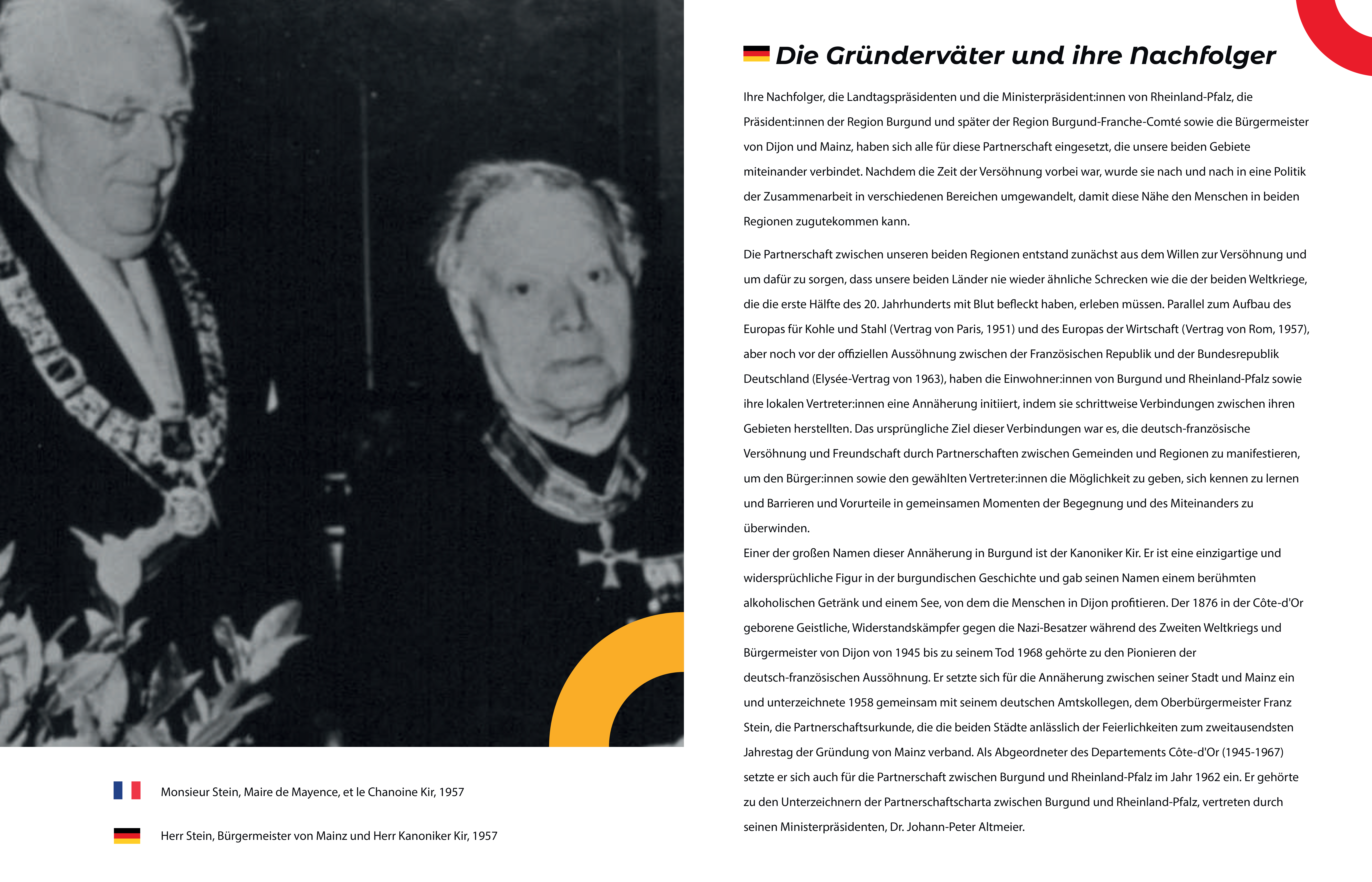 26 juin 1962 : quelques mois avant la signature du traité de l’Élysée qui scelle l’amitié franco-allemande, bourguignons et rhéno-palatins se rapprochaient déjà. Ils signaient, le Ministre-Président Johann-Peter Altmeier d’un côté, le chanoine Kir de l’autre, le premier partenariat franco-allemand régional de l’histoire. L’idée était alors de rapprocher deux peuples meurtris par les horreurs de la guerre. 60 ans plus tard, c’est plus que de l’amitié qui est célébré. Car depuis, le partenariat a bien grandi. Les deux organismes collaborent sur de multiples sujets : coopération éducative, mobilité des jeunes, transition écologique, viticulture, sport… Ils ont créé chacun de leur côté une ambassade pour encore mieux s’imprégner du territoire de l’autre : la maison de la Bourgogne-Franche-Comté s’est installée à Mayence, tandis que les Allemands ont implanté leur maison de la Rhénanie-Palatinat à Dijon, il y a tout juste 30 ans.
