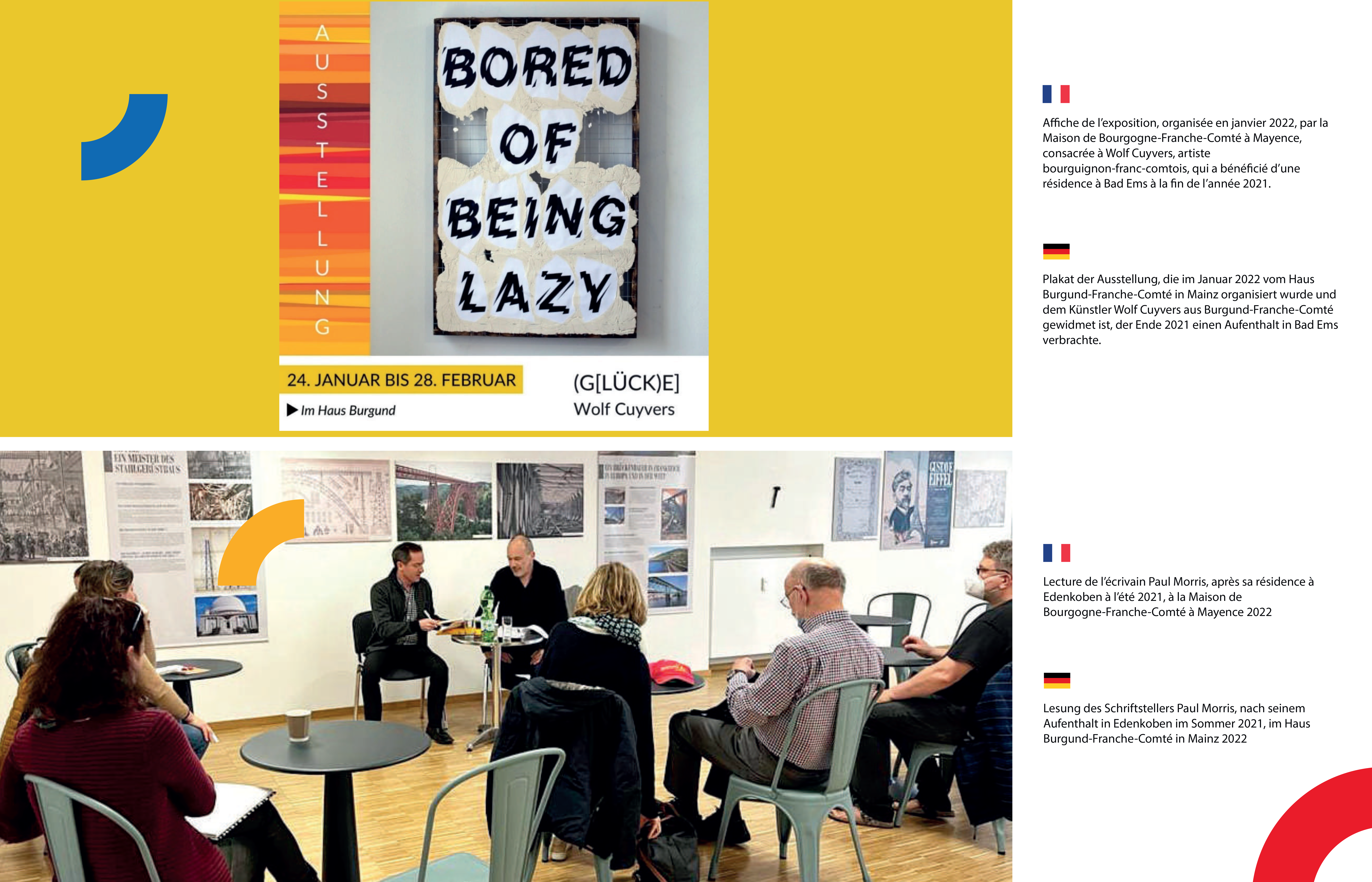 Pour marquer ce soixantième anniversaire de coopération entre les deux entités, la Région Bourgogne-Franche-Comté a réalisé une exposition photographique intitulée « 60 ans en images : engagement, amitié et coopération ». Une cinquantaine de panneaux retracent l’histoire du partenariat. L’exposition est enrichie d’archives photographiques des comités de jumelage des villes et villages de Bourgogne-Franche-Comté qui ont-elles-même tissé des liens avec des villes et villages de Rhénanie-Palatine. Le vernissage a eu lieu en présence de Marie-Guite Dufay, présidente de la Région Bourgogne-Franche-Comté, de Hendrik Hering, président du Landtag de Rhénanie-Palatinat et de Malu Dreyer, ministre-présidente du Land Rhénanie-Palatine.