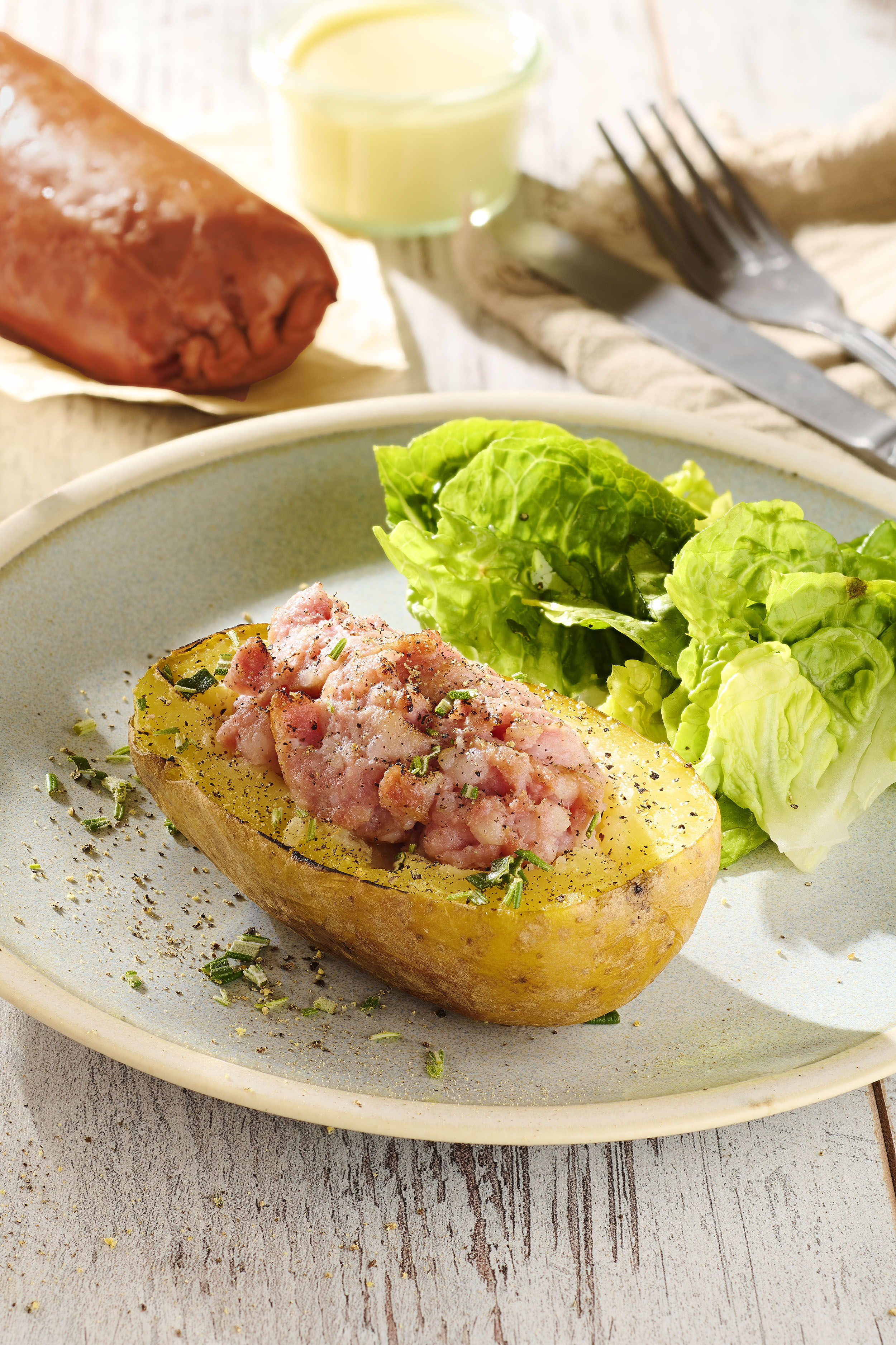 - Pour 4 personnes : 4 grosses pommes de terre, 1 saucisse de Morteau, 1 gousse d’ail, 50 g de comté, 1 salade verte